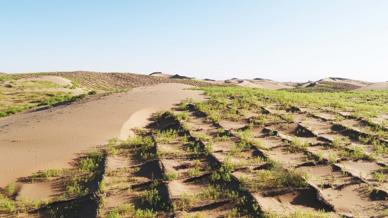 項目設置不同材料的沙障,栽植多種沙生植物,并建立沙漠治理效果監(jiān)測體系,研究不同沙障材料的耐久性,不同沙生植物的保存率,以及其在防沙治沙領域的防護效果及經(jīng)濟性,評估后期有無次生危害。通過對不同類型沙障和沙生植物防沙治沙效能評價,篩選出適宜本地區(qū)效果良好的沙障和沙生植物?;趯Y選出的沙障進行機械化布設,研發(fā)設計先進的適用于沙漠環(huán)境的固沙裝備,形成標準化生產(chǎn)車間及生產(chǎn)線。利用研制出的固沙裝備布設篩選出的沙障,栽植篩選出的沙生植物,研究出一種全新的防沙治沙技術,建立一套完整的防沙治沙新模式,進行試驗示范并推廣應用。