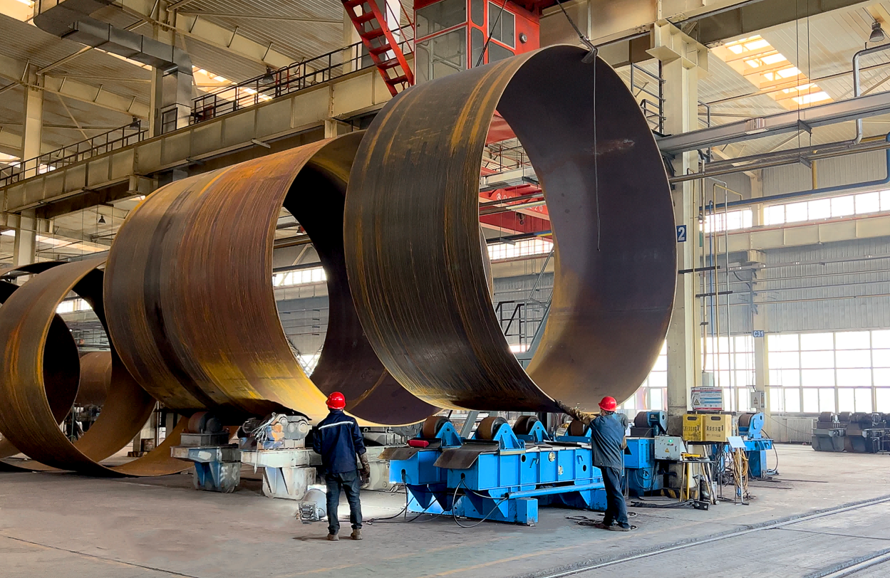踏入新能源公司本部生產(chǎn)車間,工業(yè)交響曲激昂奏響。切割設(shè)備精準(zhǔn)運(yùn)轉(zhuǎn),卷板機(jī)械有力起伏,焊接火花璀璨綻放,各道工序緊密銜接、井然有序。這里承建的金風(fēng)科技白銀靖遠(yuǎn)山東綠色能源一期風(fēng)電場(chǎng)項(xiàng)目、上海電建松山灘灘口 200MW風(fēng)電項(xiàng)目、甘肅定西通渭“十四五”第二批集中式風(fēng)電項(xiàng)目等多個(gè)甘肅省重點(diǎn)風(fēng)電項(xiàng)目正緊張施工中。生產(chǎn)線上,工人們將一段段筒圈精準(zhǔn)組對(duì),隨著機(jī)械的運(yùn)轉(zhuǎn),巨大的筒圈被緩緩吊起、對(duì)接。直徑達(dá)5.3米的巨型塔筒在精密操作下逐步成型。每套由5段組成、每段包含10個(gè)單節(jié)的塔筒,需歷經(jīng)下料、卷板、縱縫、回圓、組對(duì)、環(huán)焊、內(nèi)件、檢測(cè)、防腐等復(fù)雜且嚴(yán)謹(jǐn)?shù)墓ば?,每一步都凝聚著建設(shè)者的匠心與專注。