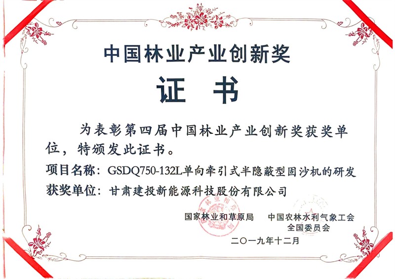 中國林業(yè)產(chǎn)業(yè)創(chuàng)新獎-GSDQ750-132L單向牽引式半隱蔽型固沙機的研發(fā)項目