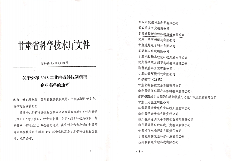 關(guān)于公布2018年甘肅省科技創(chuàng)新型企業(yè)名單的通知