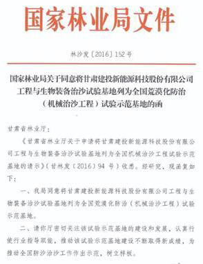 全國荒漠化防治(機械治沙工程)試驗示范基地以科學發(fā)展觀為指導,生態(tài)科學性為原則,以生態(tài)保護、生態(tài)鞏固、生態(tài)恢復、生態(tài)建設為核心,利用新能源技術(shù)、節(jié)水技術(shù)、生物技術(shù)、農(nóng)業(yè)技術(shù)、機械技術(shù),通過治沙造林、封沙育林(草)、造林綠化等,使沙漠化得以遏制、生物多樣性進一步豐富,最終實現(xiàn)生態(tài)環(huán)境狀況步入良性循環(huán)軌道,并促進經(jīng)濟社會可持續(xù)發(fā)展,獲得生態(tài)效益與經(jīng)濟效益的雙贏。(2016年10月甘肅建投新能源科技股份有限公司工程與生物裝備治沙試驗基地被國家林業(yè)局列為全國荒漠化防治(機械治沙工程)試驗示范基地)